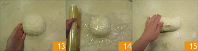 Vous devez obtenir une pâte lisse et homogène 13. Enveloppez-la ensuite dans du film plastique 14 et laissez-la reposer au réfrigérateur pendant au moins 10 minutes. Reprenez la pâte et formez un rouleau 15.
