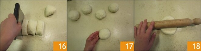 Divisez la pâte en 5 parts égales 16 et formez des petites boules 17. À l'aide d'un rouleau à pâtisserie et d'une fine couche de farine, étalez l'une des boules 18.