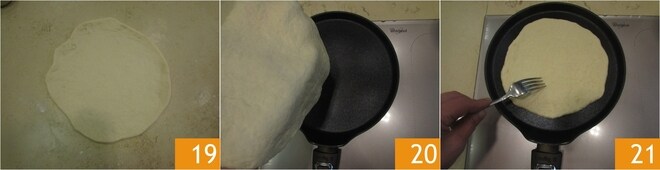 Vous devez obtenir une épaisseur de 5-6 mm 19. Chauffez bien une plaque antiadhésive et déposez la piadina 20. Laissez-la cuire environ 2 minutes et demie en perçant la surface avec les dents d'une fourchette pour éviter qu'elle gonfle 21.