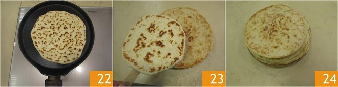Retournez ensuite la piadina et faites-la cuire encore 2 minutes et demie 22. Pendant ce temps, étalez la boule suivante et continuez ainsi jusqu'à épuisement de la pâte. Au fur et à mesure que les piadines sont cuites, vous pouvez les empiler 23 24. Les piadines épaisses sont prêtes à être garnies ou à enrichir le panier à pain !