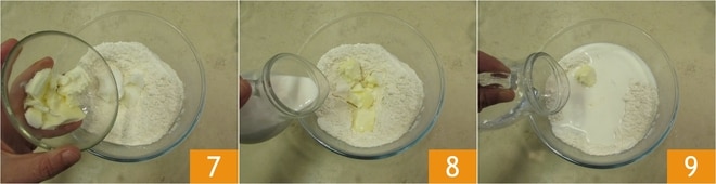 Versez également le beurre mou 7, le lait 8 et l'eau 9.