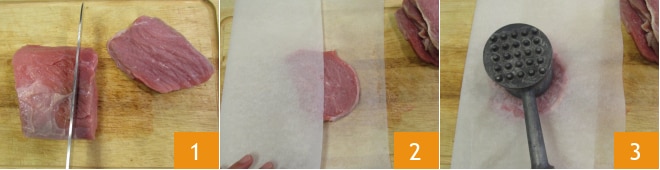 Pour réaliser les piccatine à la tomate, commencez par couper l'escalope de veau en tranches pour obtenir 4 pièces 1. Enveloppez chaque tranche dans du papier sulfurisé 2, puis battez-la avec un attendrisseur à viande 3.