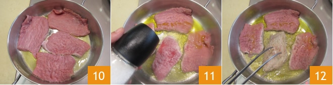 Déposez les tranches de viande 10, salez 11 et laissez-les dorer des deux côtés pendant quelques minutes, le temps de faire dorer la viande 12.