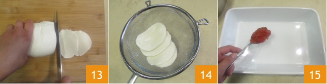 Coupez la mozzarella en tranches 13 et laissez-la égoutter dans une passoire 14, de cette façon elle ne libérera pas d'eau pendant la cuisson. Dans un plat d'environ 30x20 cm, répartissez 1-2 cuillères à soupe de tomate au fond 15.
