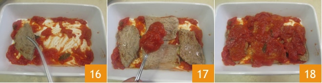 Déposez la viande 16 et versez le reste de la tomate 17, de manière à la recouvrir 18.