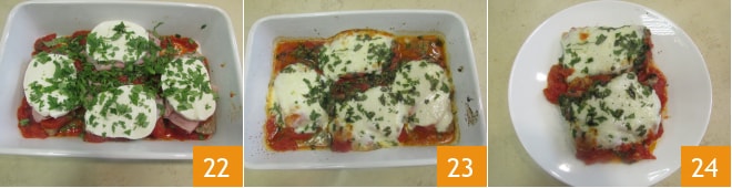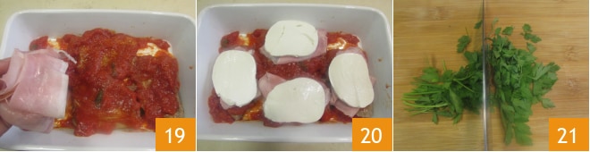 Maintenant, répartissez les tranches de jambon 19 et la mozzarella 20. Hachez le persil, préalablement lavé et séché 21.