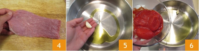 Vous obtiendrez ainsi des tranches fines 4. Dans une casserole, faites chauffer l'huile, ajoutez la gousse d'ail écrasée 5, laissez infuser pendant quelques minutes, puis ajoutez la tomate 6 et salez.