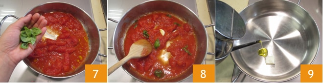 Ajoutez 4-5 feuilles de basilic 7 et faites cuire pendant environ 10-15 minutes à couvert. En fin de cuisson, éteignez le feu et réservez 8. Dans une autre poêle, faites fondre le beurre avec un filet d'huile 9.