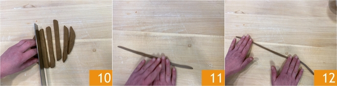 Découpez ensuite des bandes avec un couteau 10. Nettoyez maintenant le plan de travail de la farine et roulez délicatement les bandes de pâte pour obtenir de longs "spaghettoni" d'environ un demi-centimètre de diamètre 11 12.