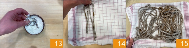 Au fur et à mesure que vous les formez, passez-les dans la farine pour éviter qu'ils ne collent entre eux 13 et disposez-les sur un plateau bien fariné 14. Continuez jusqu'à épuisement de la pâte, en veillant à ne pas superposer les pici pour ne pas abîmer leur forme 15. Gardez-les dans un endroit frais.