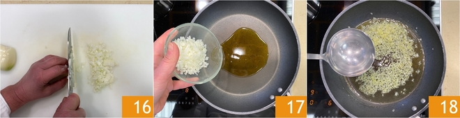 Passez à la sauce aux petits pois : hachez finement l'oignon 16 et laissez-le revenir dans une casserole avec un filet d'huile 17 pendant quelques minutes, en mélangeant souvent et en ajoutant un peu d'eau chaude 18.