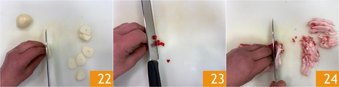 Coupez-le en tranches pas trop fines 22. Puis coupez également le piment en morceaux 23 et les lardons en lanières 24.