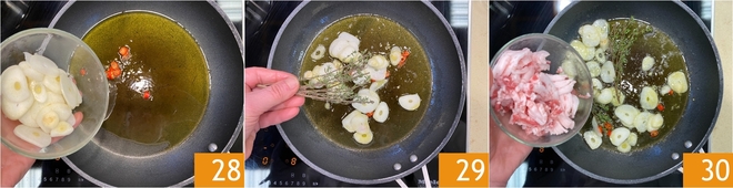 Mettez sur le feu une casserole remplie d'eau salée qui servira pour la cuisson des pici. Dans une grande poêle, chauffez un autre filet d'huile d'olive extra vierge et ajoutez le piment, l'ail géant 28, quelques brins de thym 29 et les lardons coupés en lanières 30.