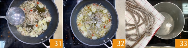 Faites revenir à feu moyen-vif jusqu'à ce que les lardons soient bien dorés et aient libéré leur graisse, en remuant pour ne pas brûler les arômes; à ce stade, mouillez avec une petite louche d'eau de cuisson 31 et éliminez le thym. Entre-temps, l'eau sera arrivée à ébullition, plongez donc les pici 33.