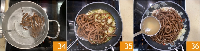 Ils seront prêts lorsqu'ils remonteront à la surface. Égouttez-les 34 et transférez-les directement dans la poêle avec l'assaisonnement d'ail géant et de lardons 35, ajoutez encore une petite louche d'eau de cuisson 36 et faites-les sauter pendant quelques minutes.