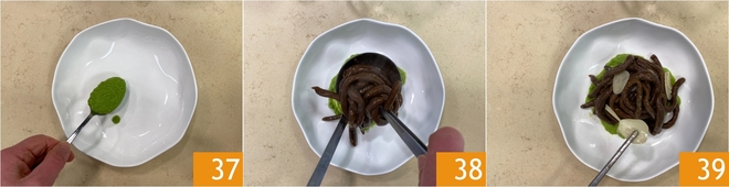 Vous êtes prêt à dresser : étalez la sauce aux petits pois à la base de l'assiette, puis déposez dessus un nid de pici bien assaisonnés et ajoutez quelques tranches d'ail géant et un peu de lardons 39.