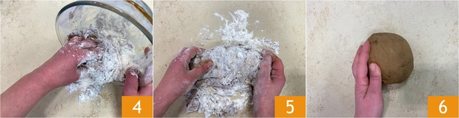 Pétrissez ensuite avec vos mains jusqu'à ce que le café soit complètement absorbé. À ce stade, transférez la pâte sur le plan de travail et continuez à la travailler énergiquement pendant environ 10 minutes 5, afin de la rendre élastique et compacte; elle doit être souple mais non collante 6.