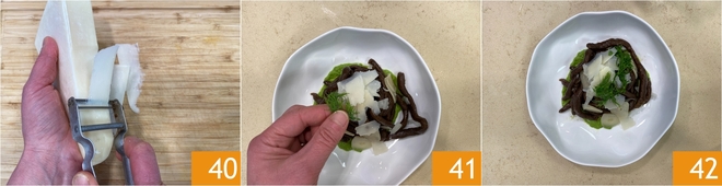 Avec un éplucheur, réalisez des copeaux de pecorino 40, ajoutez-les dans l'assiette et complétez en décorant avec du fenouil 41 et avec des germes de petits pois pour une touche fraîche et parfumée. Servez immédiatement les pici au café avec ail géant, lardons et petits pois, bien chauds 42.