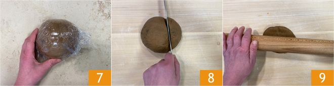 Lorsque vous aurez obtenu une pâte lisse, formez une boule, enveloppez-la dans du film plastique et laissez reposer pendant au moins 30 minutes à température ambiante 7. Après le temps de repos, reprenez la pâte et prélevez-en une portion 8, en couvrant la partie restante. Étalez-la avec un rouleau pour l'aplatir jusqu'à une épaisseur de 0,5 cm 9.