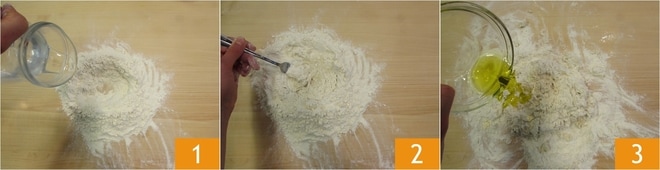 Pour préparer les pici toscans, versez la farine sur une planche et créez la forme classique de fontaine. Versez d'abord l'eau 1 et commencez à mélanger avec une fourchette 2. Ajoutez ensuite aussi l'huile 3.