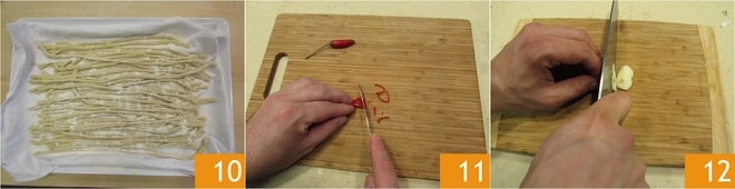 Disposez-les au fur et à mesure sur un plateau avec un torchon bien fariné pour éviter qu'ils ne collent entre eux 10. Passez maintenant à l'assaisonnement. Coupez en tranches le piment 11 et les gousses d'ail 12.