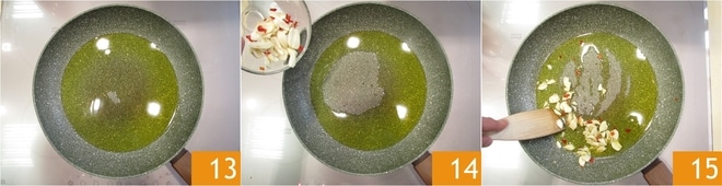 Versez de l'huile d'olive extra vierge dans une poêle antiadhésive 13, puis ajoutez les gousses d'ail géant et le piment 14. Laissez cuire à feu doux pendant environ 15-20 minutes pour que l'ail cuise doucement. Lorsqu'il sera tendre, écrasez-le 15.