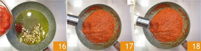 Ajoutez la pulpe de tomate 16 et le sel 17. Laissez cuire encore pendant 15 minutes 18.