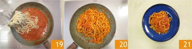 Cuisez les pici dans une abondante eau salée pendant environ 6-7 minutes, puis égouttez-les et versez-les dans l'assaisonnement 19. Mélangez bien les pici, en les sautant 20 et dressez-les dans l'assiette 21.
