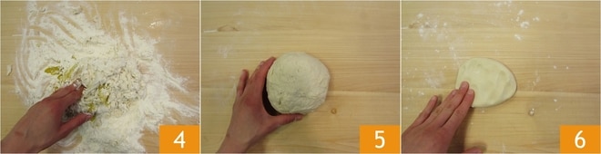 Pétrissez pendant environ 6-7 minutes 4, jusqu'à obtenir un mélange homogène 5. Enveloppez dans du film plastique et laissez reposer pendant 30 minutes. Après 30 minutes, reprenez une partie de la pâte et aplatissez-la d'abord avec les mains 6.