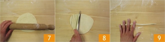 Étalez-la avec un rouleau à pâtisserie pour atteindre une épaisseur d'environ 1 cm 7 puis coupez-la en lanières d'une largeur d'environ 1 cm 8. Maintenant, formez les pici : roulez individuellement les lanières sur le plan de travail pour former de grands et longs spaghettis 9.
