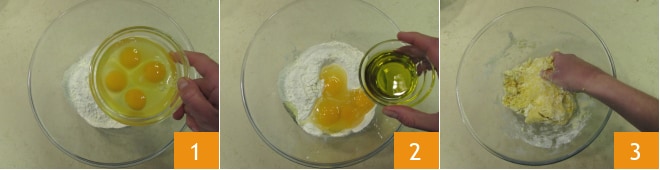 Pour réaliser les piconi des Marches, versez la farine, les œufs 1 et l'huile 2 dans un bol. Pétrissez bien avec les mains 3 jusqu'à obtenir une pâte lisse et homogène.