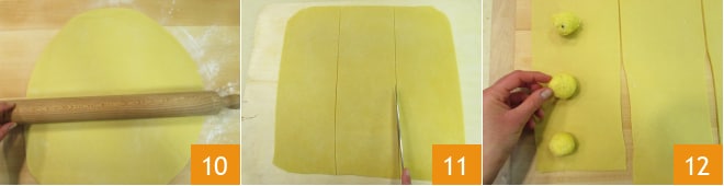 Reprenez la pâte et étalez-la avec le rouleau à pâtisserie à environ 2 mm d'épaisseur 10. Coupez des bandes d'environ 10 cm de large 11. Disposez à environ 5 cm de distance une cuillère de garniture (environ 20 g) façonnée en boule avec les mains 12.