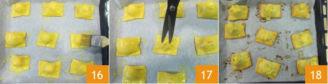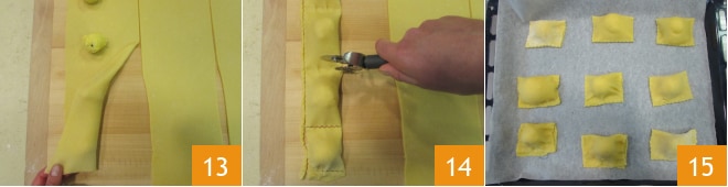 Repliez la pâte sur elle-même pour couvrir la garniture 13, puis avec une roulette crantée, découpez des “raviolis” d'environ 8 cm de longueur et 5 de largeur 14. Avec ces quantités, vous obtiendrez environ 30 raviolis. Disposez les piconi sur une plaque recouverte de papier sulfurisé 15.