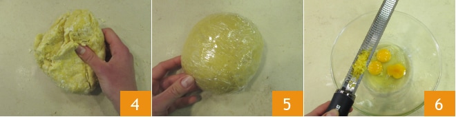 Transférez-la sur un plan de travail 4, formez une boule et couvrez-la d'un film plastique 5. Laissez reposer pendant 30 minutes à température ambiante. Pendant ce temps, préparez la garniture : dans un bol, versez les œufs et le zeste de citron 6.