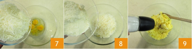 Ajoutez également le parmesan 7 et le pecorino râpés 8, mélangez pour amalgamer et enfin salez et poivrez 9.