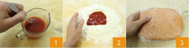 Pour réaliser les pie pops, commencez par préparer la pâte brisée rouge en suivant notre recette de la pâte brisée à la tomate : mélangez le concentré de tomate dans l'eau glacée 1. Procédez avec la technique du sablage : mettez dans un mixeur la farine tamisée, le beurre froid, une pincée de sel et mixez le tout jusqu'à obtenir un mélange sablonneux. Disposez le mélange obtenu sur un plan de travail en forme de fontaine classique et ajoutez au centre le concentré de tomate dilué dans l'eau 2, pétrissez le tout rapidement jusqu'à obtenir une pâte compacte. Une fois prête, enveloppez votre pâte brisée dans un film alimentaire 3 et laissez-la reposer au frigo pendant au moins 40 minutes.
