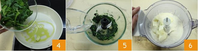 Consacrez-vous maintenant à la pâte brisée verte : faites sauter les épinards à la poêle avec un filet d'huile et une gousse d'ail 4, quand ils seront tendres, transférez-les dans le mixeur et mixez-les avec la quantité d'eau froide à ajouter à la farine, soit 35 ml 5. Continuez en réalisant le sablage avec la farine et le beurre dans le mixeur 6,