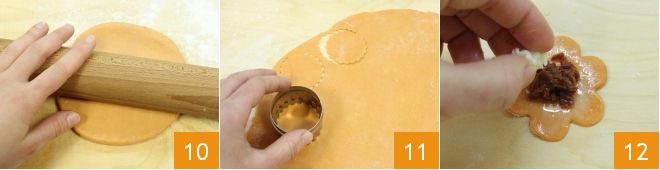 À ce stade, tout est prêt pour composer les pie pops : reprenez la boule de pâte brisée à la tomate, étalez-la avec un rouleau à pâtisserie 10 jusqu'à obtenir une épaisseur de 2 mm, découpez avec des emporte-pièces les formes désirées 11 en veillant à ce qu'elles soient doubles, badigeonnez la découpe de pâte avec le blanc d'œuf, garnissez la partie centrale avec les tomates séchées et le caciocavallo 12,