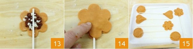 placez au milieu un bâtonnet alimentaire 13 puis refermez avec une découpe de même forme 14. Mettez de côté les pie pops sur un plateau recouvert de papier sulfurisé 15.