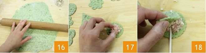 Procédez de la même manière avec la pâte brisée verte : étalez une pâte d'environ 2 mm d'épaisseur 16, badigeonnez avec l'œuf et garnissez-la avec le mélange de caciocavallo et jambon cuit 17. Refermez avec une autre découpe de pâte 18.