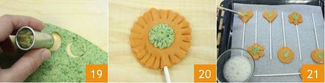 Si vous souhaitez rendre les pie pops encore plus colorés, vous pouvez découper de petites formes 19 à appliquer sur les pie pops en alternant les couleurs pour créer un joli contraste 20. Avant de les enfourner, badigeonnez les pie pops avec du blanc d'œuf 21