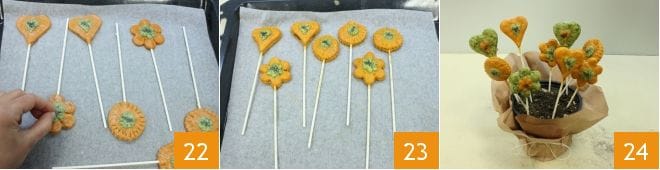 et si vous le souhaitez, garnissez-les avec des graines de pavot 22, enfin, faites-les cuire dans un four statique préchauffé à 180° pendant environ 15 minutes (si four ventilé à 160° pendant 5-10 minutes). Une fois cuits, laissez tiédir les pie pops 23 puis servez-les en les plantant dans un vase comme s'ils étaient de délicieuses petites fleurs 24 !