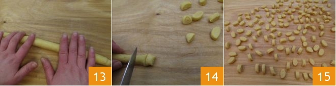 Roulez chaque morceau pour obtenir des boudins 13, découpez ensuite des petits gnocchis de 1 cm (14-15).