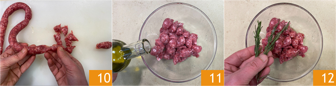 En attendant, occupez-vous de la saucisse : retirez la peau et émiettez-la avec vos mains pour obtenir des morceaux de quelques centimètres 10. Transférez la saucisse dans un bol et assaisonnez avec de l'huile 11 et du romarin 12. <\/p>