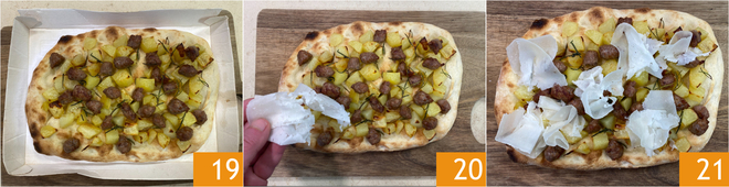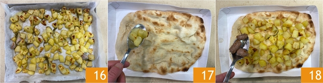 Une fois la cuisson terminée, sortez les pommes de terre du four 16. À ce stade, prenez les bases pour pinsa et répartissez les pommes de terre rôties sur la surface 17, puis ajoutez également la saucisse dorée 18. <\/p>