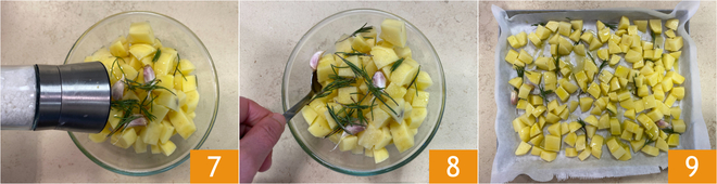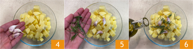 Rassemblez les cubes de pommes de terre dans un bol, puis assaisonnez avec les gousses d'ail en chemise 4, les aiguilles de romarin 5 et l'huile 6.<\/p>