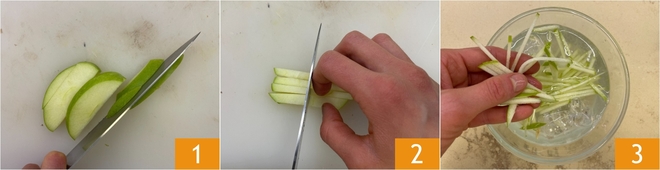 Pour préparer la pinsa au saumon, commencez par la pomme verte : lavez-la bien, puis sans enlever la peau, coupez-la d'abord en quartiers puis en bâtonnets 1, dont vous obtiendrez des allumettes d'environ 3 cm de long et 5 mm d'épaisseur 2. Plongez les pommes dans de l'eau, de la glace et du jus de citron jusqu'au moment de les utiliser, elles ne bruniront pas ainsi 3.