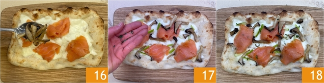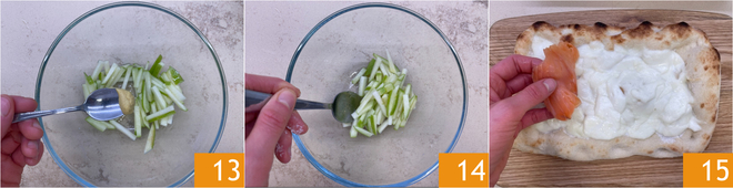 Assaisonnez aussi avec le sel et la moutarde 13, puis mélangez bien 14. Sortez la pinsa du four et disposez les tranches de saumon fumé 15.