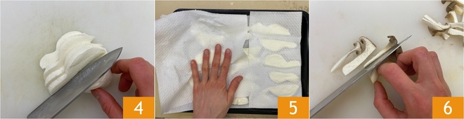 Coupez la mozzarella en tranches d'environ 3 mm d'épaisseur 4, déposez-les sur un plat et tamponnez-les bien avec du papier absorbant 5. Réservez, puis coupez les pleurotes cardoncelli en tranches 6.