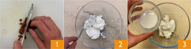 Pour préparer la pinsa aux fleurs de courgette, anchois et crème au fromage, commencez par hacher les tomates séchées 1. Dans un bol, mélangez le fromage à tartiner avec la ricotta 2, puis ajoutez le lait 3.